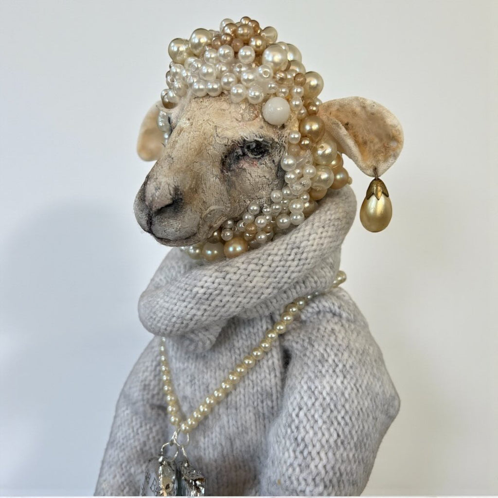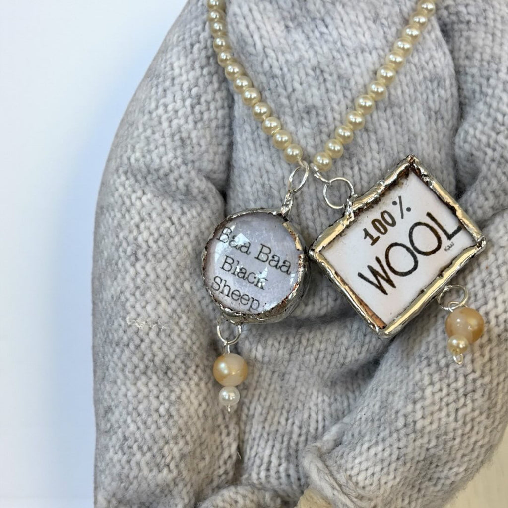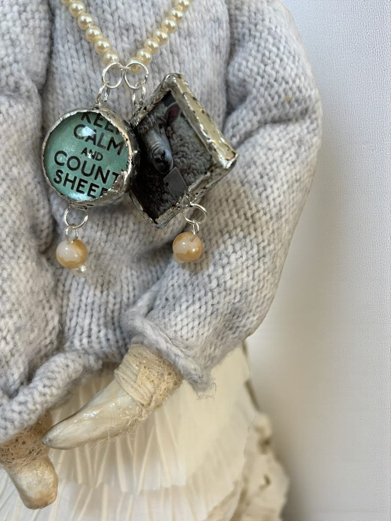 Mixed media; fabric, recycled plastic, clay, pearls, and beads, 11.8" x 5.1" (30 cm x 13 cm)