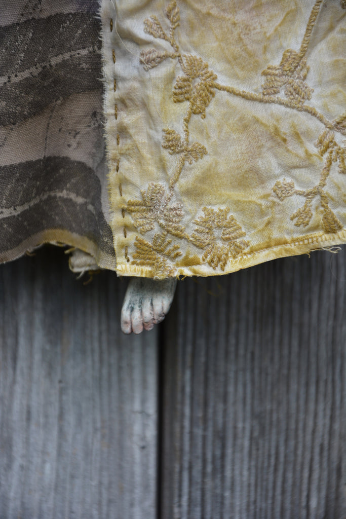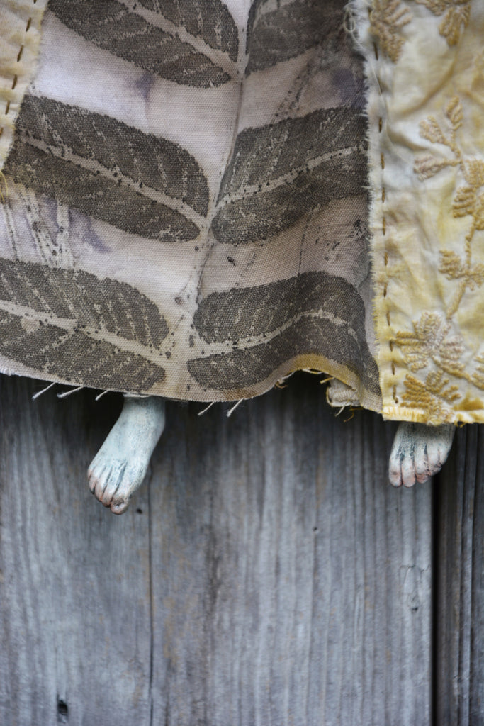 Materials: paper clay, alpaca wool, silk fabric, embroidered fabric, eco-printed with real leaves fabric. The leaf lungs are hand embroidered, 19" tall