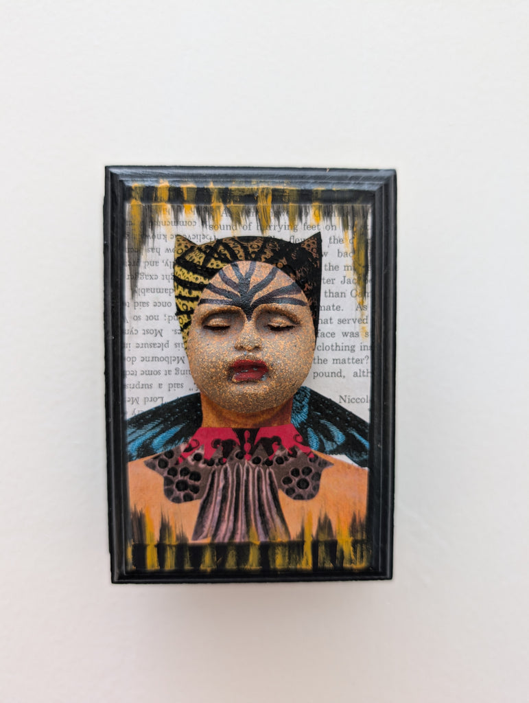 Mixed media on wood, 3 x 5". Includes ceramic elements made by Claudia.