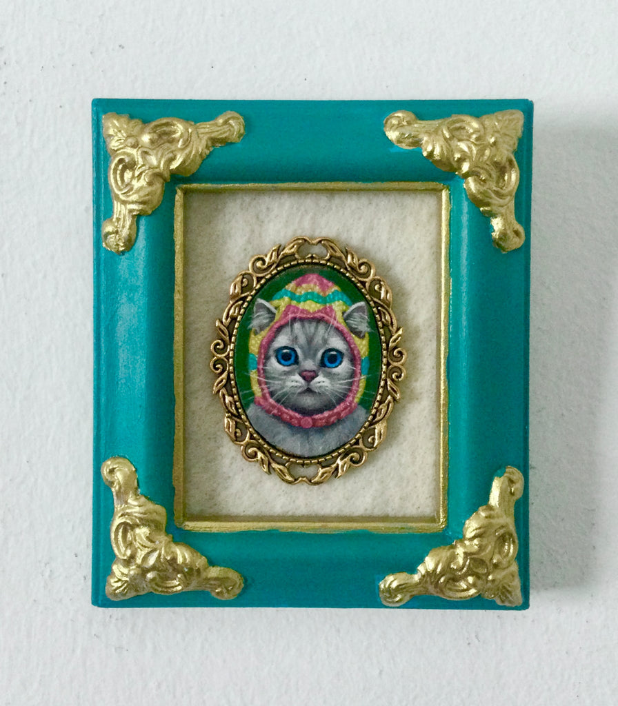 The mini painting is attached to a brooch and then set in a hand painted vintage frame, 2.5" X 2".