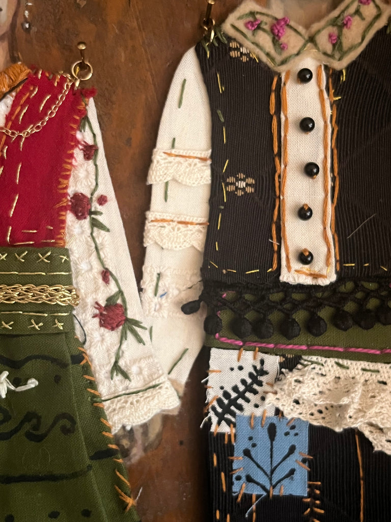 Oil paint on wood, fabric, beads, embroidery, and charms, 10 x 14"