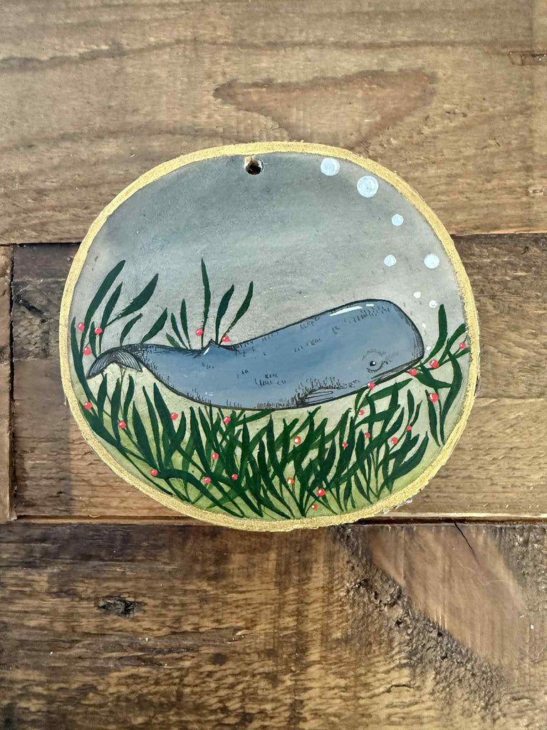 Acrylic on wood, 4.5” diameter, with a brown, jude twine loop for hanging. Comes in a wee gift box.