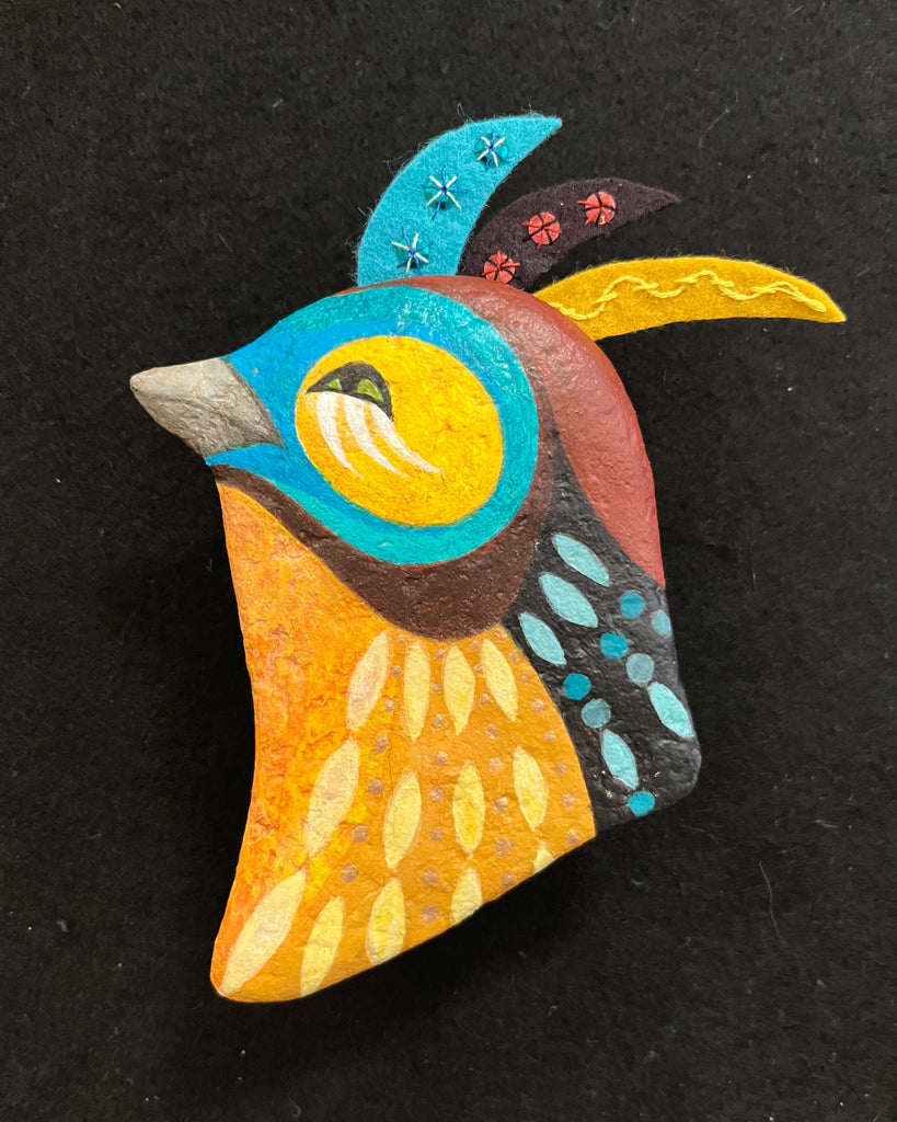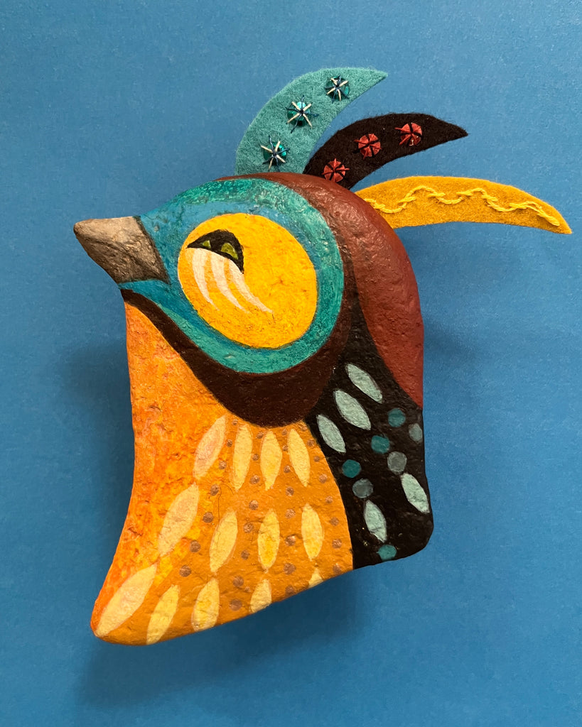 Paper mache, acrylics, embroidered & sequined felt feathers