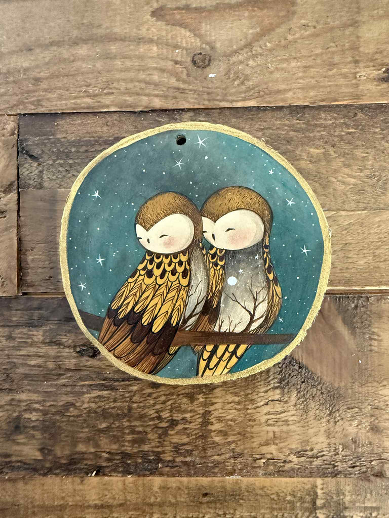 Acrylic on wood, 4.5” diameter, with a brown, jude twine loop for hanging. Comes in a wee gift box.