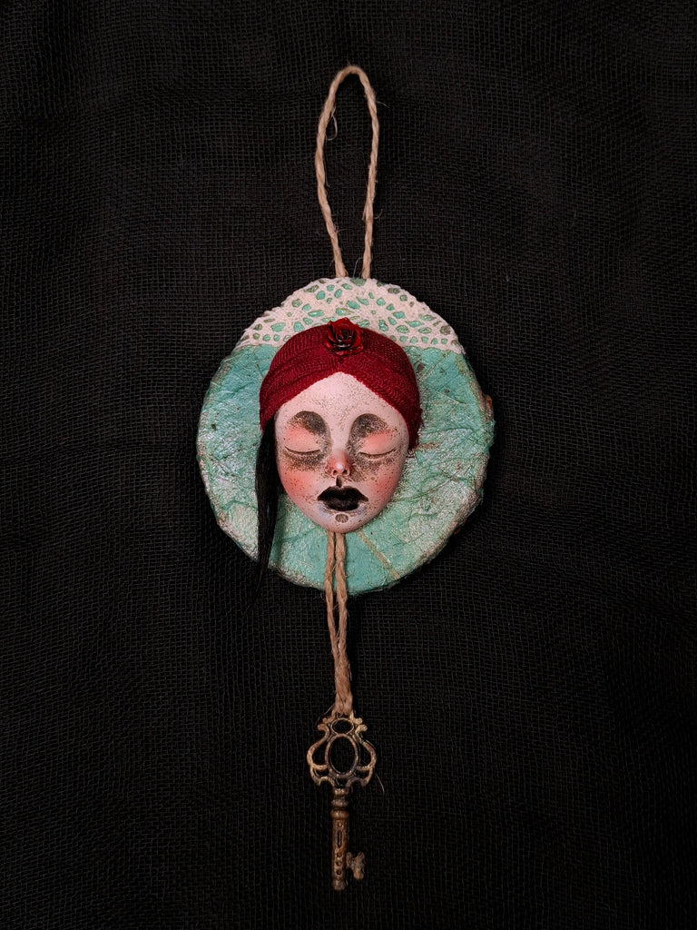 Mixed media - paperclay, wooden disc, lace, Japanese paper, key. She is painted with acrylics, soft pastels and colored pencils, and sealed with matte varnish.