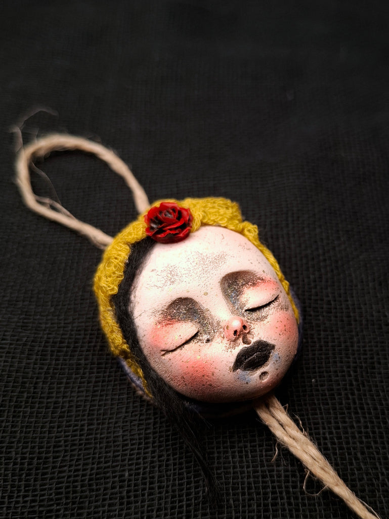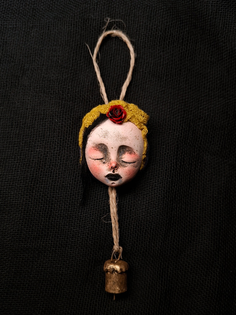 Mixed media - paperclay, wooden disc, Japanese paper, tiny bell. She is painted with acrylics, soft pastels and colored pencils, and sealed with matte varnish.